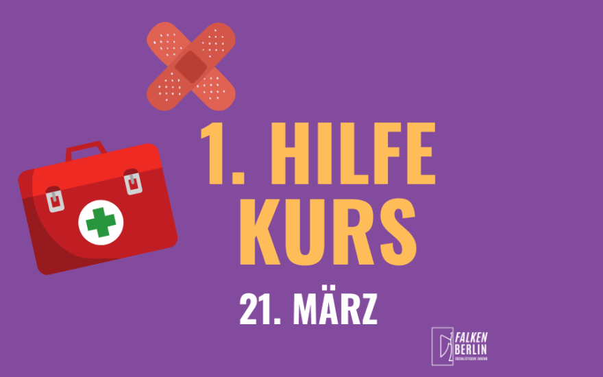 Der 1.Hilfe Kurs ist für alle Aktiven Falken und Teilnehmer_innen der Falken-Juleica kostenlos. Für externe Personen kostet die Kursteilnahme 50€. Im Anschluss an den Kurs erhaltet ihr eine Kurszertifikat, welches ihr auch für die Fahrerlaubnis verwenden könnt.