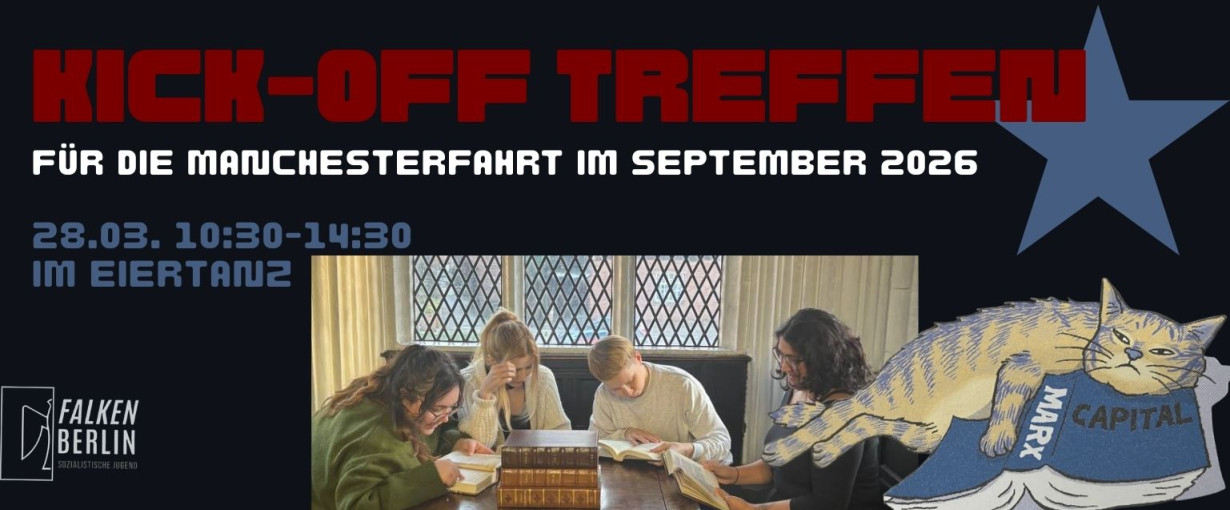 Beim Kick-off Treffen am 28.03. werden wir uns als Gruppe kennen lernen und besprechen wie die Fahrt ablaufen soll. Außerdem wird es einen Einstiegsworkshop zur Kapitalismus und zu Marx und Engels in Manchester geben.