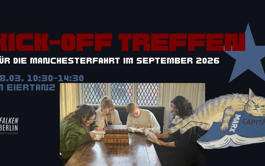 In den letzten beiden Septemberwochen wollen wir als Gruppe gemeinsam nach Manchester fahren. Bei der Fahrt wollen wir auf den Spuren von Marx und Engels die Stadt kennenlernen, über Kapitalismus und Kolonialismus lernen und uns gemeinsam einen schöne Zeit machen.